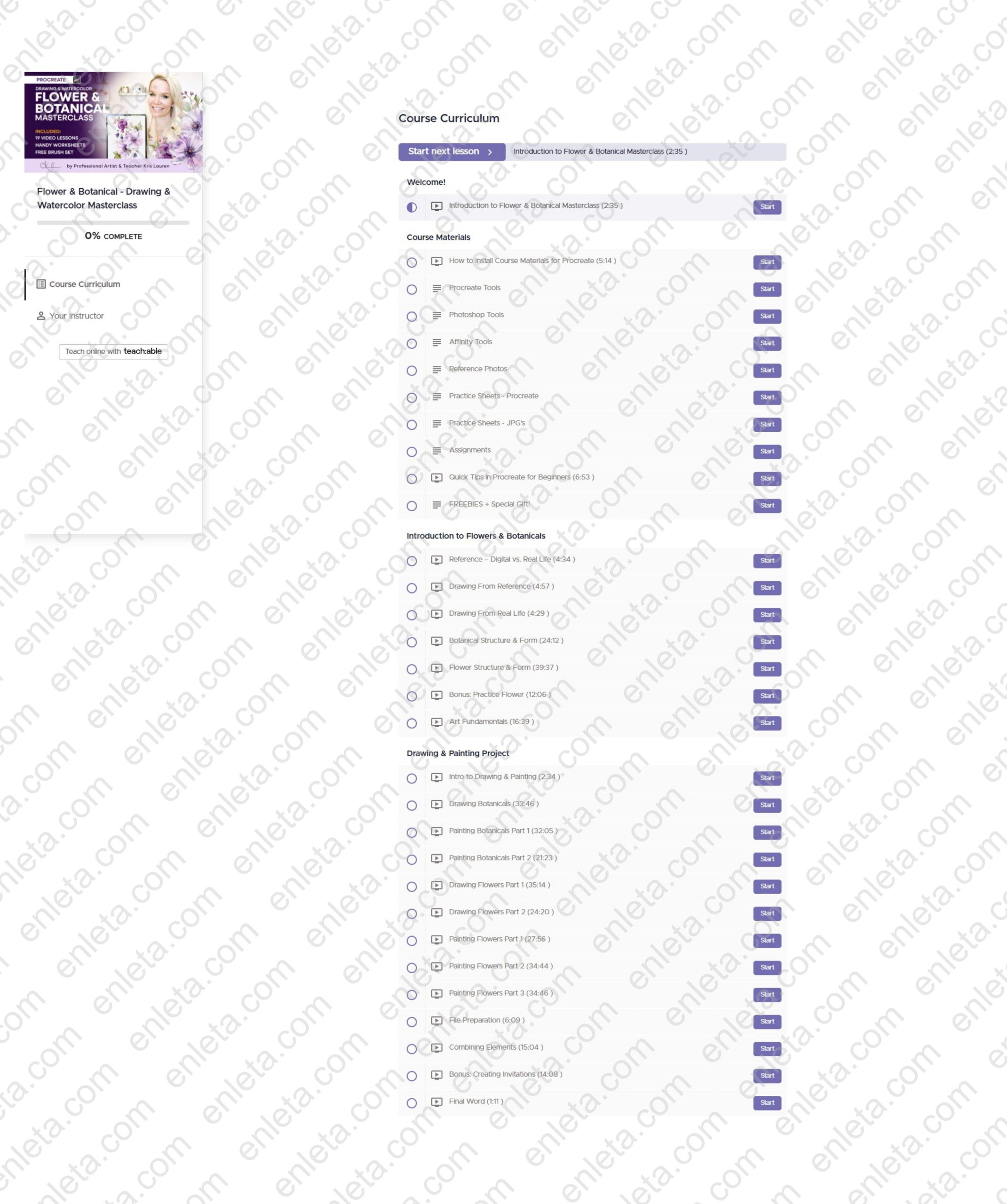 Flower & Botanical – Drawing & Watercolor Masterclass by Kris Lauren is a comprehensive online art program that guides learners step-by-step through drawing and painting realistic florals and botanicals using digital watercolor techniques. It begins from foundational principles—drawing from life and reference, understanding botanical structure—and over 19 video tutorials builds toward advanced compositions, color work, file preparation, and real-world applications like invitations. The course is designed to be accessible to beginners yet robust enough to help intermediate artists refine their style.