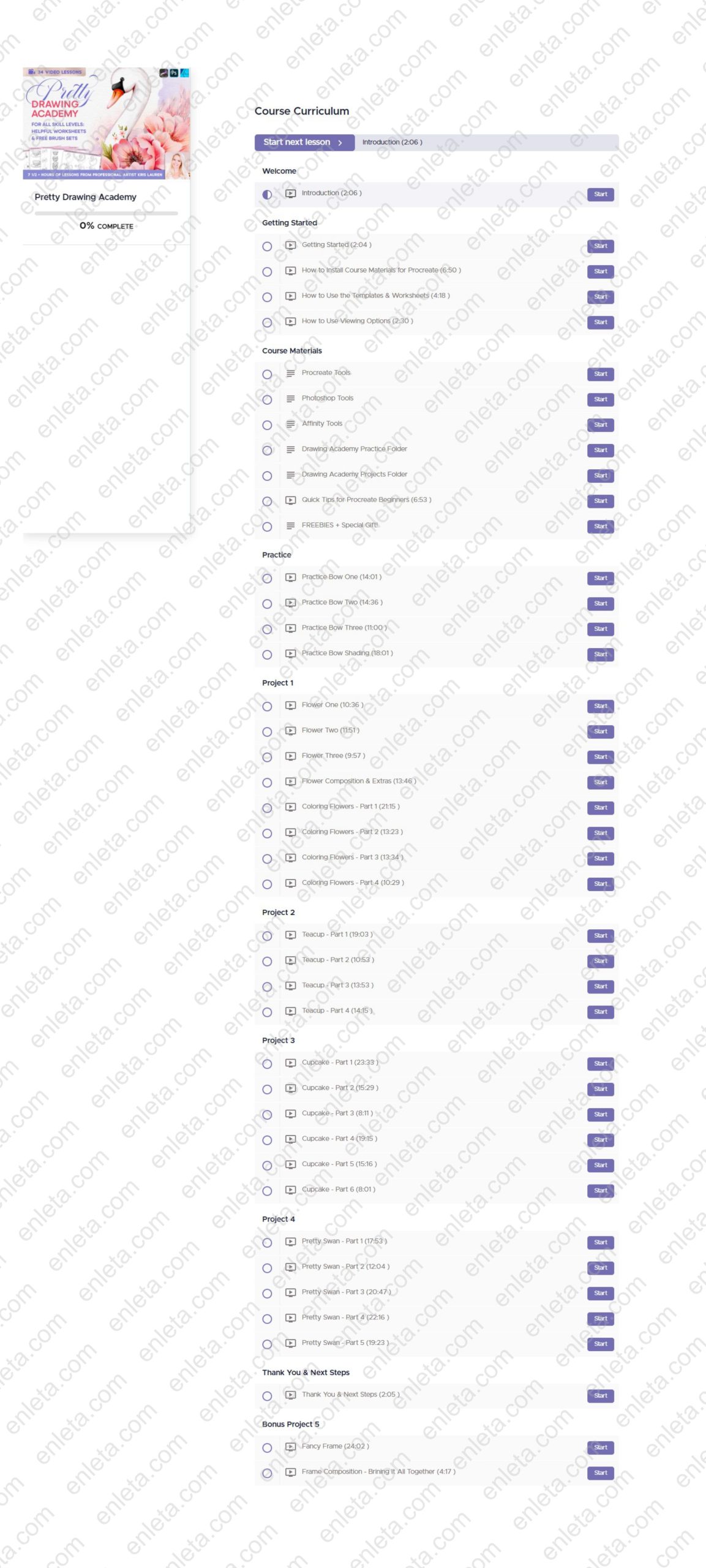 The curriculum is structured in successive modules that begin with basic sketching and shading exercises, then progress to more complex compositions such as flowers, teacups, cupcakes, swans, and decorative frames. The teaching method emphasizes incremental, bite-sized steps so the artist never feels overwhelmed: first learning simplified guides, then rough sketches, then coloring, texture, and refinement. Over time, students build a portfolio of charming pieces while absorbing a visual language of elegance and softness.