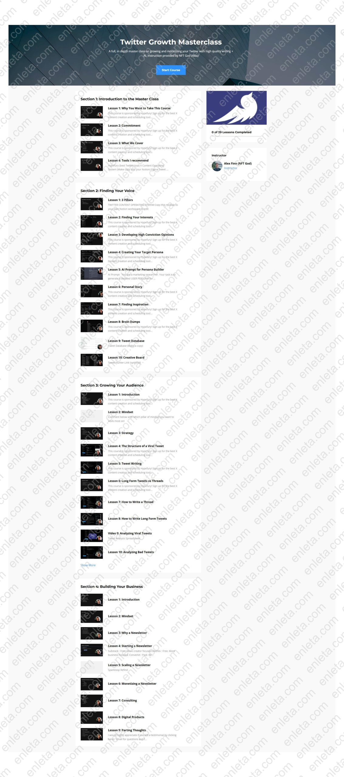 X Growth Masterclass – Twitter Growth Masterclass by Alex Finn is a digital content training program focused on helping creators turn their X (formerly Twitter) presence into measurable growth and monetization. In this masterclass, Alex Finn shares the blueprint he used to scale from small audiences to a large following, and how he converted content into income. The curriculum consists of 40 plus video lessons and over five hours of in-depth guidance on ideation, content writing, hook generation, growth strategies, engagement systems, and funneling toward offers.